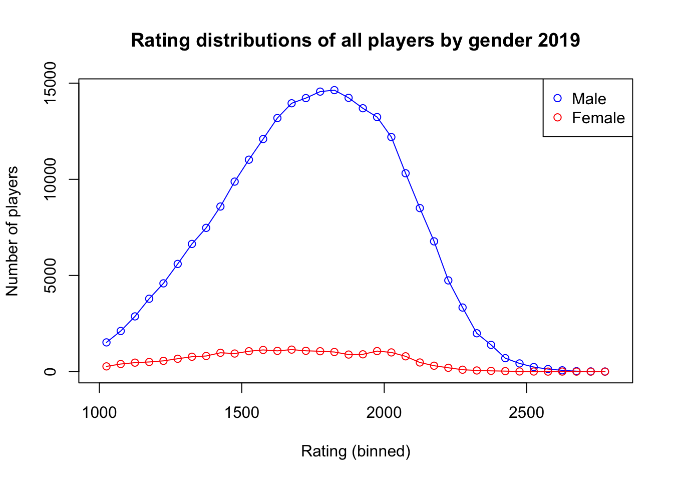Some have posited that there are differences between men and women which spring out of some genetic component somewhere deep in the chess parts of the brain that were responsible for early human victories over our greatest animal adversaries – allowing us to stall for time with a friendly game of chess until members of our tribe could come spear our adversaries while played for a draw. Thus chess skill would necessarily be unevenly distributed among genders much as hunting was before our species settled down to enjoy some agriculture. Still others believe that chess has an issue with too few women playing which is what explains the majority of the gap between the performance at the highest levels of chess. Due to a lack of recorded games from prehistory, I instead seek to show this second explanation is sufficient for explaining this variation between the two genders in terms of performance.