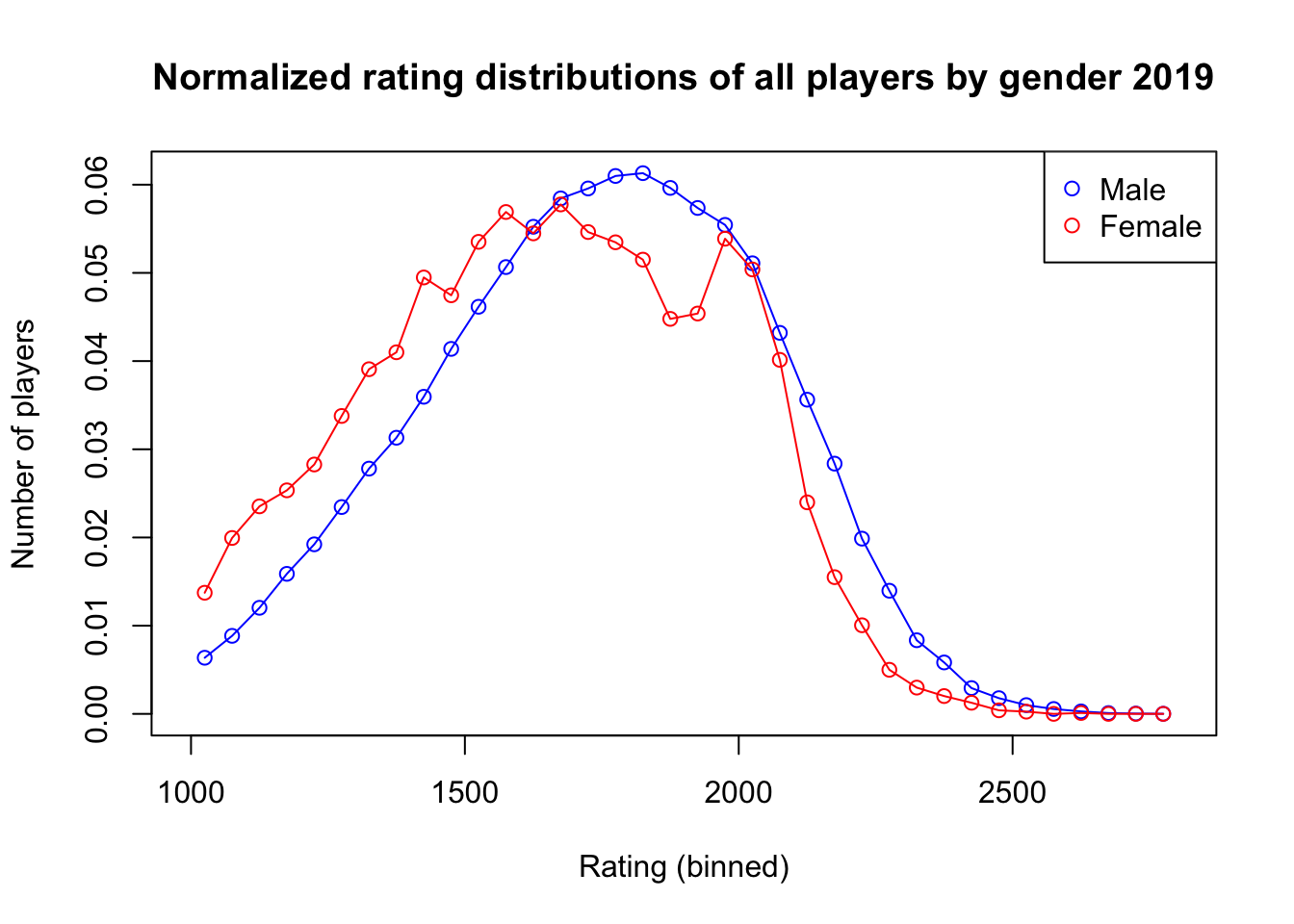 Here we adjust the rating distributions by number of participants for both men and women in order to see if the shape and location of the distributions are significantly different. We can see the slight leftward shift in the female ratings distribution consistent with the ~90 rating point difference found earlier. ::: {.cell hash=‘chess_fide_cache/html/unnamed-chunk-18_098a5874808402b3e841e6f66368c8c9’}