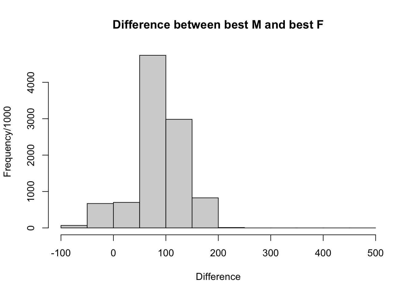 hist(delta, breaks = seq(-100, 500, by = 50), main = 'Difference between best M and best F',