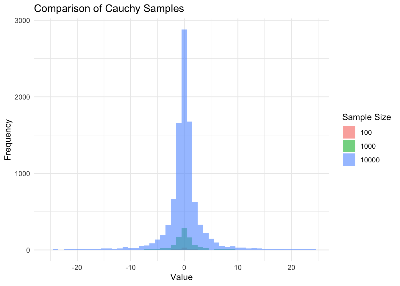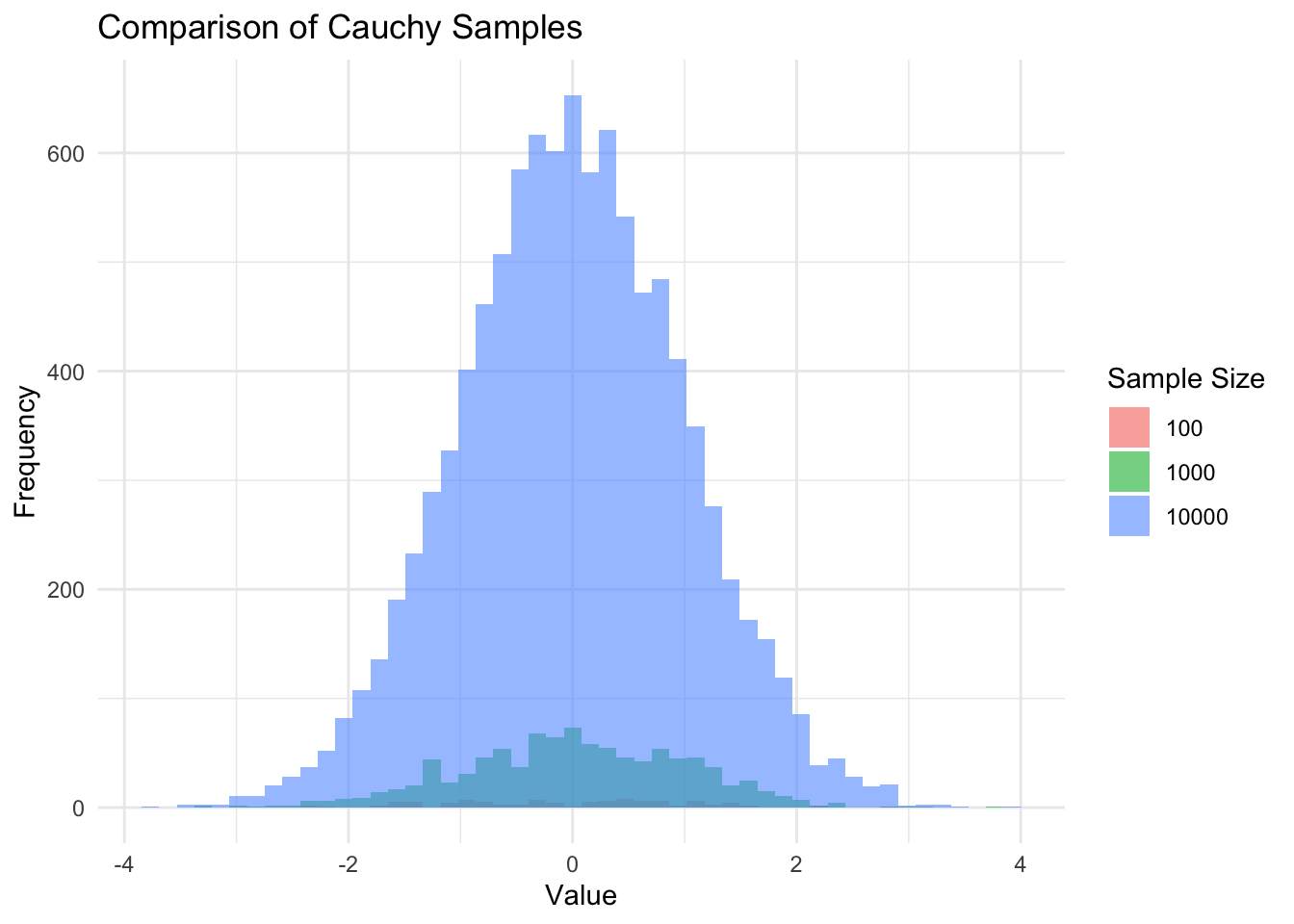 labs(title="Comparison of Cauchy Samples", x="Value", y="Frequency") +